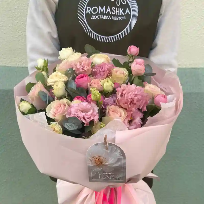 Букет «Ассорти» включает розы сорта Фрутетта, кремовые кустовые розы, кустовые розы Жизель, эустомы и эвкалипт, оформлен в декоративную упаковку. Композиция рассчитана на вручение и размещение в помещении.