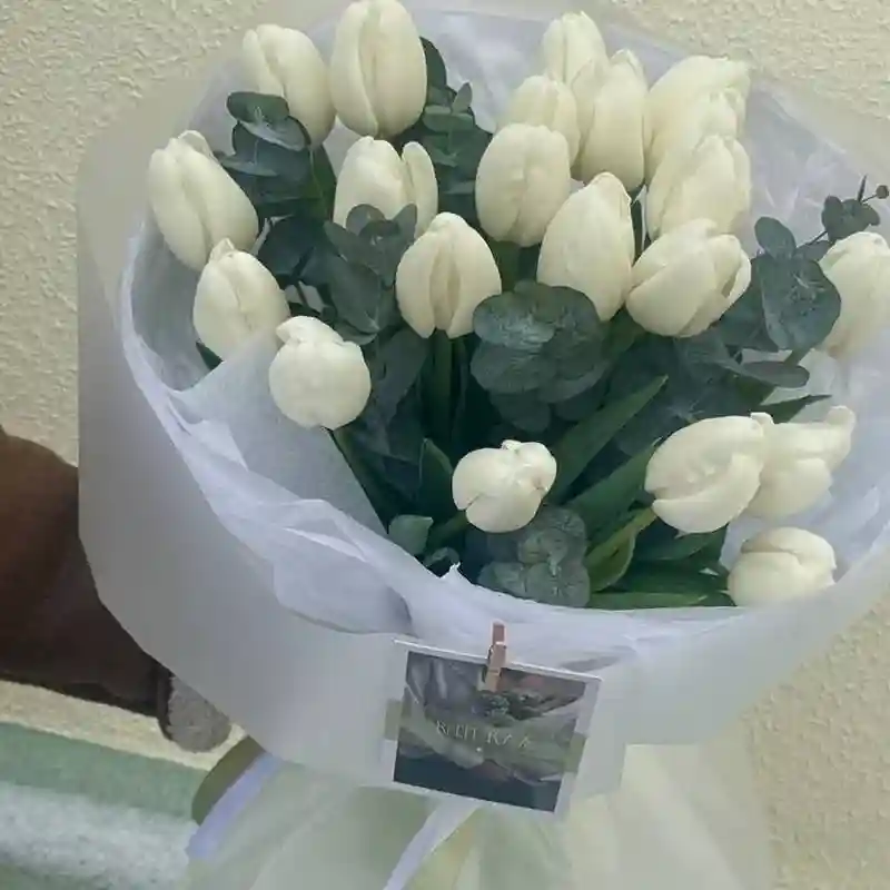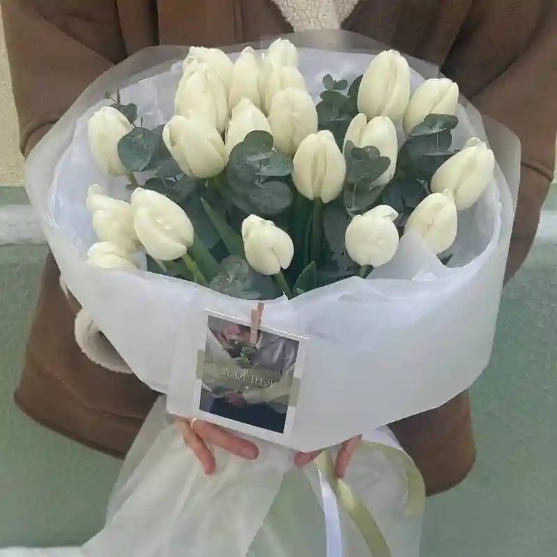 Букет «Нежный поцелуй» состоит из 21 тюльпана и 2 ветвей эвкалипта, оформлен в декоративную упаковку. В основе — плотная посадка тюльпанов с прямым стеблем и свежей зеленью. Цена — 145 белорусских рублей.