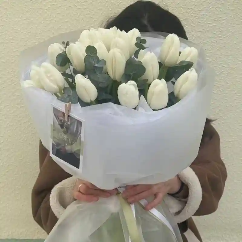 Тюльпаны продолжают рост после срезки и реагируют на свет. В воде они вытягиваются и могут менять направление стебля. Для сохранения формы требуется холодная вода и обновление среза. «Нежный поцелуй» подходит как для подарка, так и для оформления интерьера. Композицию размстите в высокой вазе с достаточным уровнем воды.