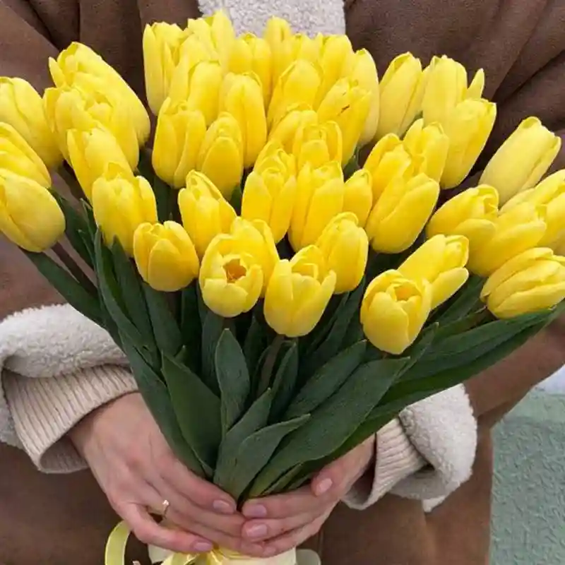 Тюльпаны продолжают расти после срезки. Стебли вытягиваются и могут менять направление к источнику света. Для сохранения формы требуется прохладная вода и регулярное обновление среза. Листья не должны находиться в воде. При умеренной температуре бутоны раскрываются постепенно и держат плотность несколько дней. «Объятия весны» — это букет жёлтых тюльпанов в количестве 51 штуки по фиксированной цене 280 белорусских рублей.
