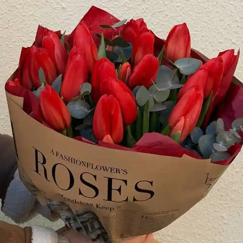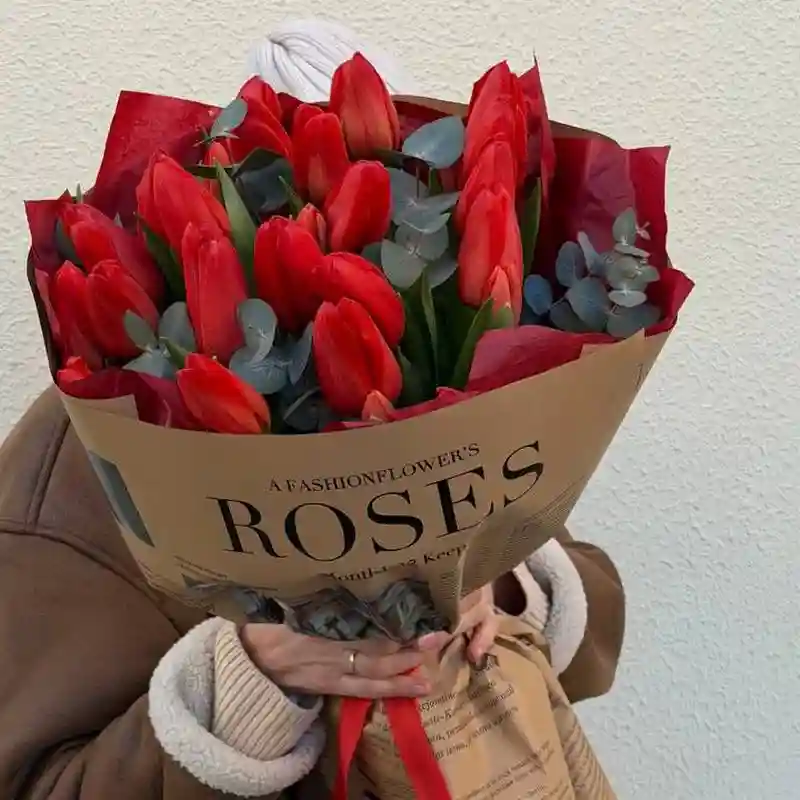 Букет «Признание» включает 19 тюльпанов и 3 ветви эвкалипта, оформлен в декоративную упаковку. В составе — срезанные тюльпаны и свежий эвкалипт без дополнительных элементов. Стоимость композиции — 145 белорусских рублей.